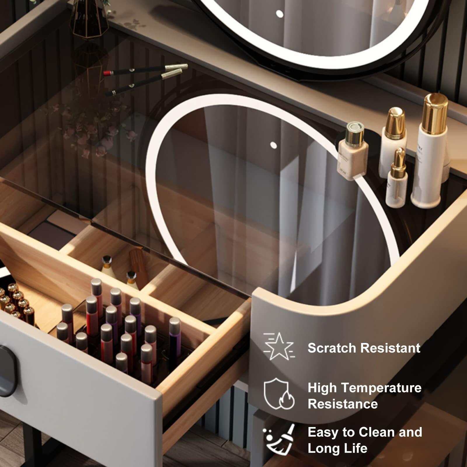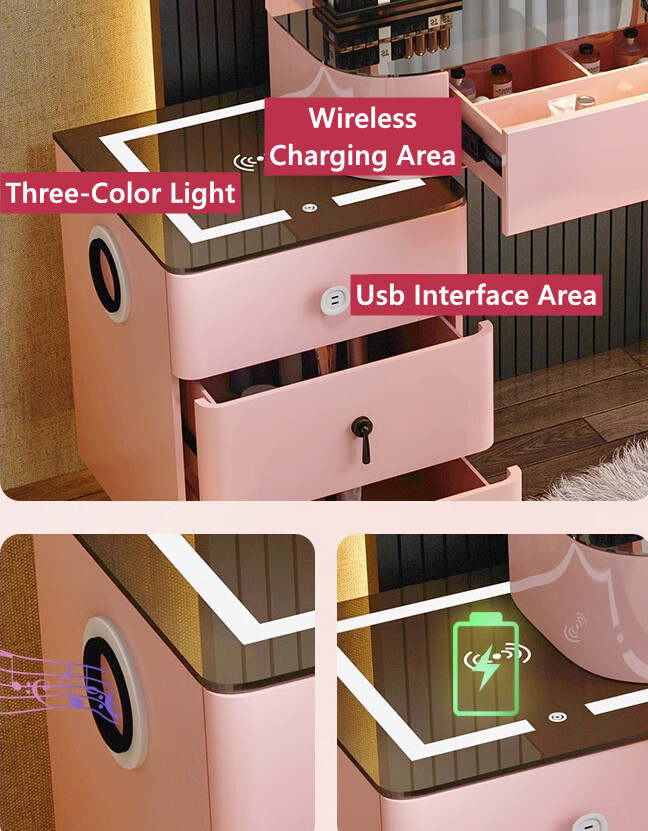 - ✿【Powerful Storage Capacity】Makeup vanity with drawer, provides ample storage space to easily organize your makeup, jewelry and other accessories. At the same time, the dresser desktop still has a lot of space for your computer or other office supplies. Make your room neater and cleaner. Intelligent multi-functional drawer, wireless charging/Bluetooth audio, hidden wireless induction not subject to "wire" control