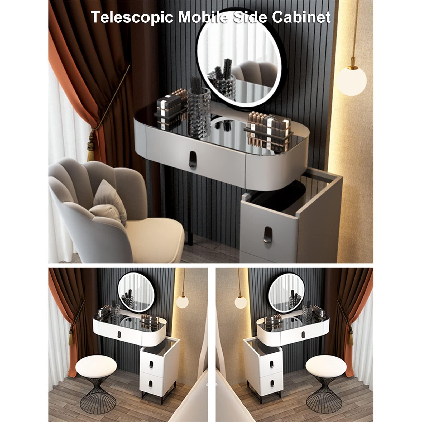 - ✿【Flexible combinations】Both left and right can be installed to suit your different needs.The movable side cabinet is retractable from left to right, saving space for your room. Dressing Table Set Included: 1 x Vanity Desk, 1 x Round Mirror, 1 x Chair, 1 x Storage Cabinet